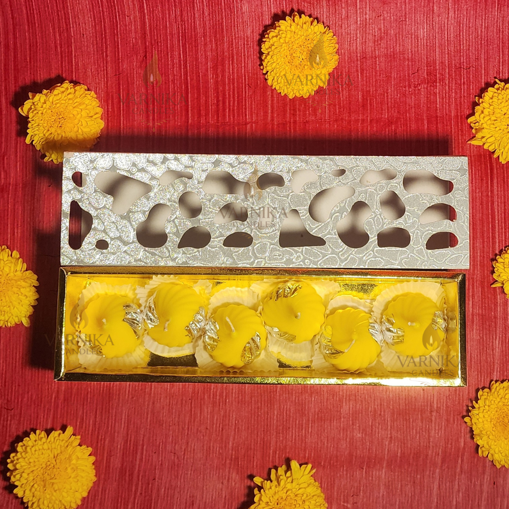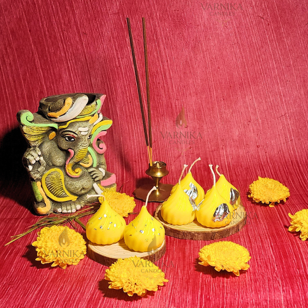 This pack includes 6 handcrafted Yellow Modak Candles made with soy wax and mango fragrance, ideal for home décor, puja rituals, and festive gifting.